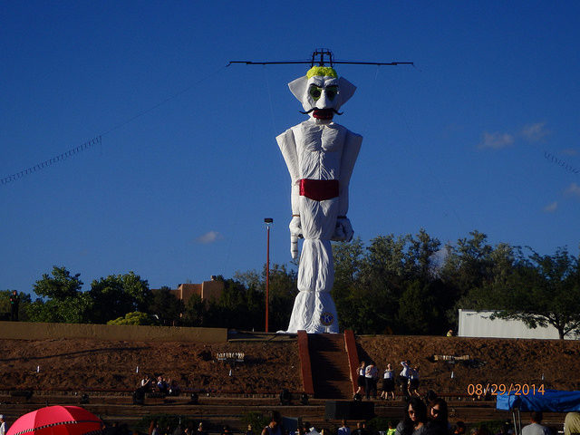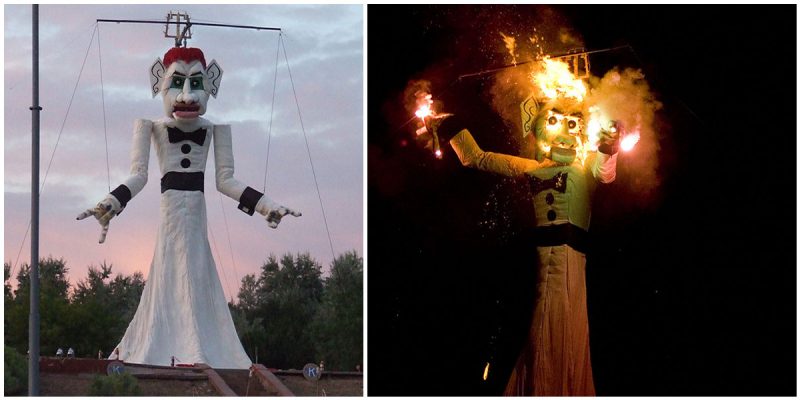 Zozobra first appeared as a six-foot puppet, but the figure has since grown to be over 50 feet tall. It is one of the world’s largest functioning marionettes, able to wave his arms and move his mouth to growl ominously prior to meeting his demise.
