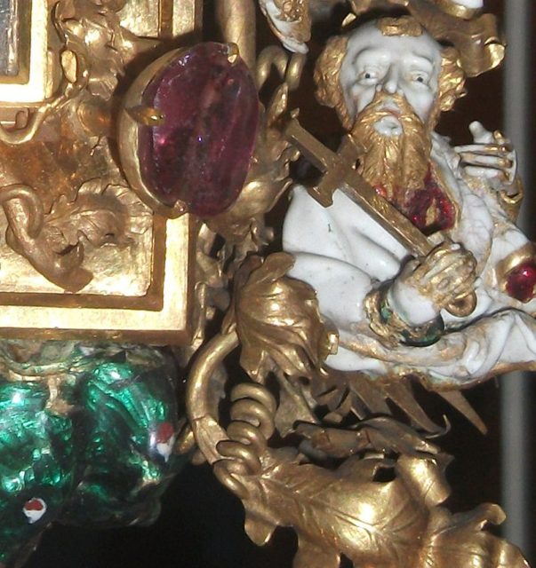 The reliquary is made of white enamel with golden designs and has no blue enamel color because it would cover the light of the beautiful sapphires. The maker of the Holy Thorn reliquary is unknown and there is no sign or mark because the goldsmiths of that period rarely did that.