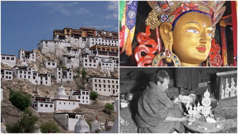 As they did this, two crows appeared out of the blue and carried away the ceremonial plate with the torma offerings; they placed it on the other side of the hill. Palden and Sherab went on to look for the torma and they found it placed on a stone in perfect order by the two crows. For Palden, this was a divine sign that the new larger monastery should be built here. The legend is also related to another premonition made by Tsongkhapa, who had foreseen that the new doctrine will flourish once a new larger temple emerges on the right bank of the Indus River. The prediction came true and the name of the monastery would be Thikse, meaning “in perfect order.”