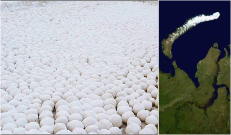 A very rare event has occurred on a beach in northwest Siberia. Along an 11 mile stretch of the Siberian coastline in the Gulf of Ob lay hundreds of frozen snowballs with size that varies between the measurement of a tennis ball up to 3 feet wide.
