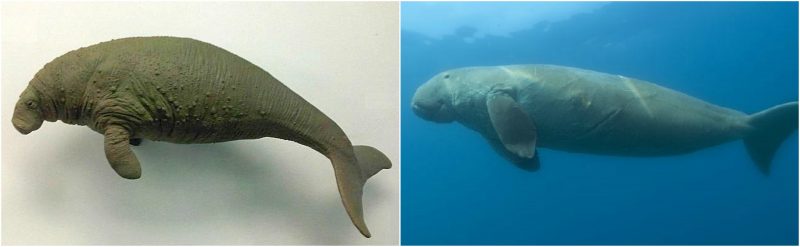 The tail was forked like a dolphin’s tail, the head of the animal was quite small in comparison to the body, its tongue was rough and textured and it did not have teeth like the other sirenians but had stiff bristles and keratinous plates in its mouth for chewing. It had small eyes and long, wide nostrils; like sirenians of today it had no eyelids but used sphincters to close its eyes. According to Steller, the sea cow made no sound other than heavy breathing and deep sighs.