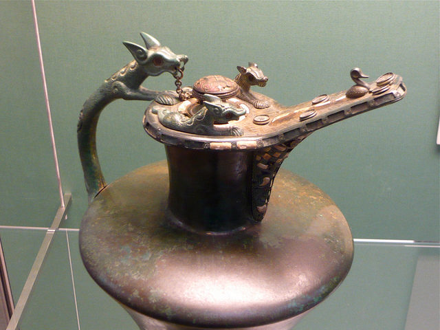 The vessel fittings are richly decorated, showing a mixture of styles – for example, the handle is formed as a dog or wolf which is an idea that comes from Greek and Etruscan culture.