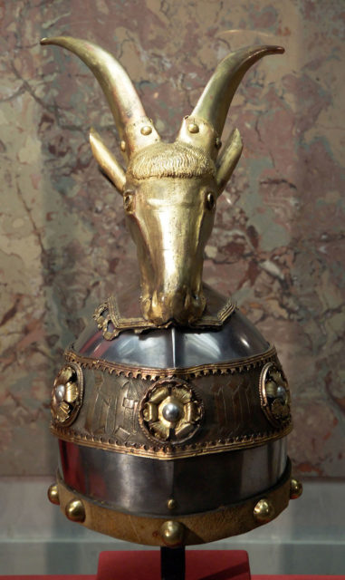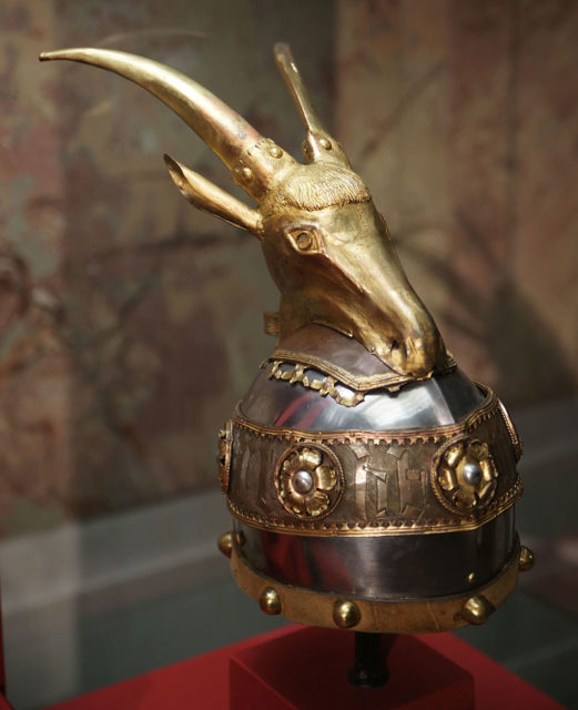 In 1928, when Albania became a kingdom, the helmet of Skanderbeg was adopted as the national royal crown. The helmet is beautifully made of white metal and has a strip dressed in gold. The most remarkable part is the golden horned goat which lies on the top of the head.