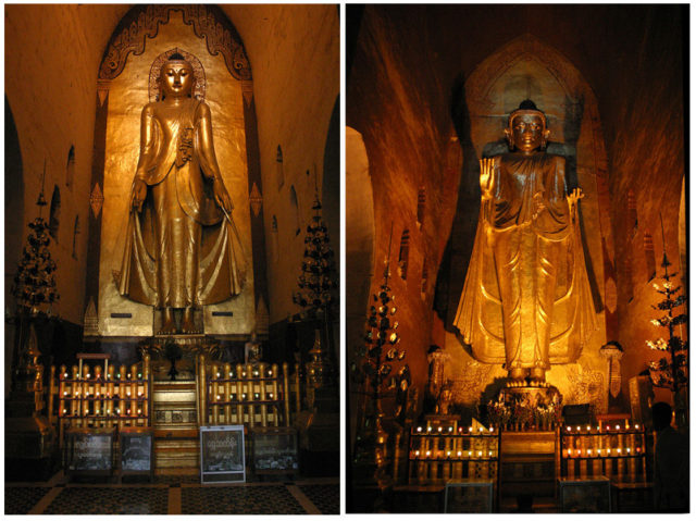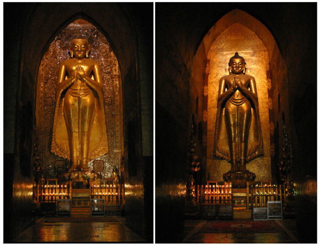 Each of the sculptures faces one of the 4 cardinal directions, and all of them are adorned with gold leaf. The sculptures facing north and south are said to be original, and the eastern and western sculptures were made later in the Mandalay style.
