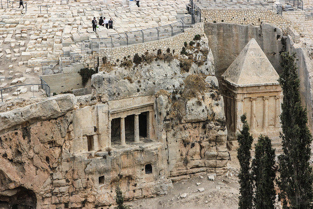 The Tomb of Zechariah is an ancient monument located in the upper Kidron valley, at the foothills of Mount Olives, facing the old city of Jerusalem. Carved from a single stone, the monument was built in the 1st century CE at the end of the Second Temple Period.