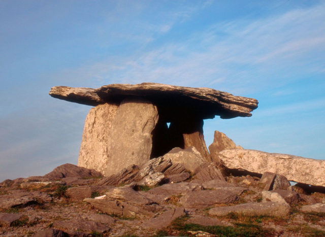 The cairn helped to stabilize the tomb chamber and wouldn’t have been higher during the Neolithic period. The tomb is surrounded by a low mound made of rocks and built on a limestone pavement. There are 70 other similar tombs in the same area, including one at Gleninsheen.