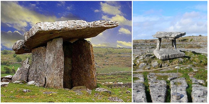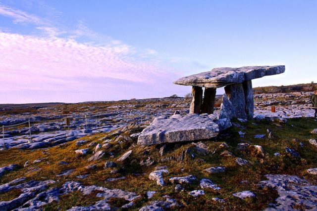 Poulnabrone dolmen means “hole of the quern stones” in Irish. The dolmen dates back to the Neolithic period, sometime between 4200 BC and 2900 BC. It has two large standing parallel portal stones, capped with a massive sloping capstone. The standing portal stones are 5 feet high and create a chamber below in a 29.5-foot low cairn.