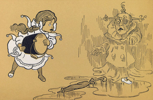The Wicked Witch herself dies in a horrible way when Dorothy splashes her with a bucket of water. She melts away and turns into an amorphous puddle of muddy substance beneath Dorothy’s silver shoes.