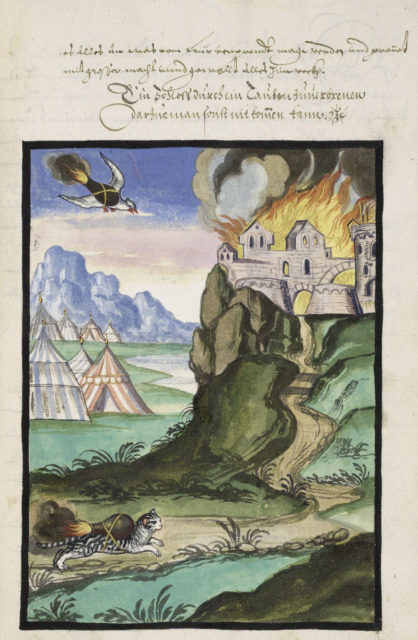 In medieval Russia and Scandinavia, artillery masters were known to strap incendiary devices to cats and birds. Such way of setting cities and forts on fire was so popular in medieval China that it was included in several warfare manuals.