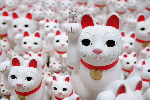 This figurine, which in translation from Japanese means “Beckoning Cat”, traditionally depicts a calico Japanese Bobtail cat. Originally made from wood, today it can be seen made of ceramic and plastic, sitting at the entrance to almost every restaurant and shop window in Japan with its paw raised and bent, beckoning people to enter.