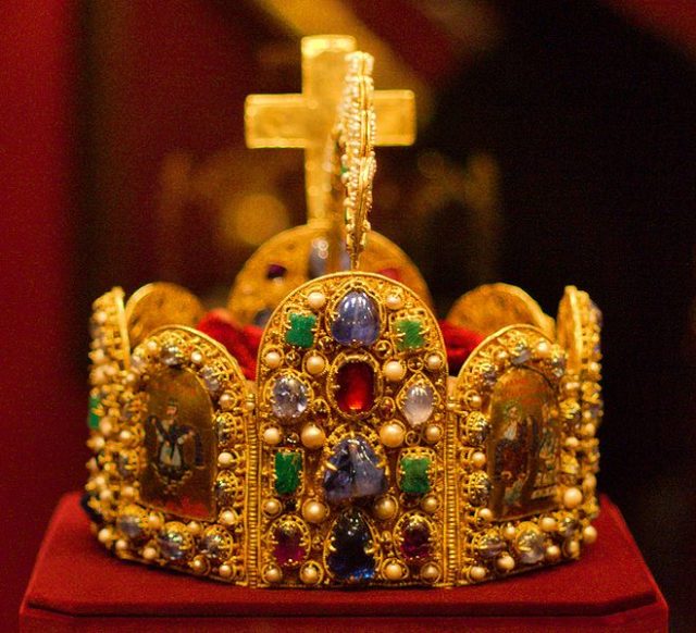 Like most modern crowns, this crown does not have a round shape, but an octagonal one and IT is made of eight round-topped plaques of gold, hinged together. The number eight refers to the number of perfection, claimed for the emperor as the royal number. It is ornamented with 144 precious stones (including sapphires, emeralds, and amethysts) polished into rounded shapes, as well as more than one hundred pearls.