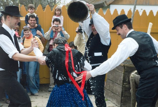 The whole celebration sounds like a prank. Traditionally, during the morning on Easter Monday, a boy would sneak up into the home of the girl he likes and pour a bowl of water over her while she’s still sleeping and then spank her legs with a willow branch.