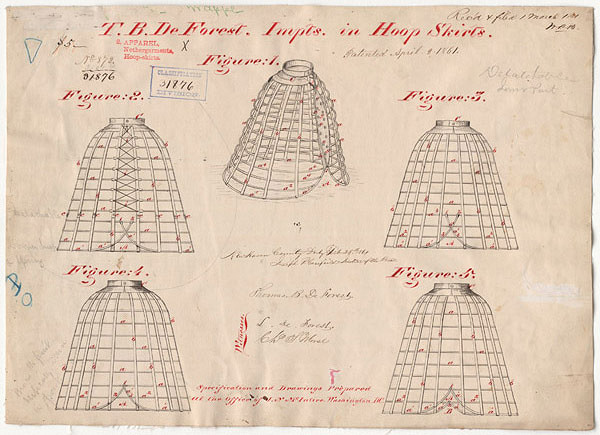 One of the most widely known models is the cage crinoline which was first patented in 1856 by R.C. Milliet in Paris. His agent brought it to Britain and it became popular overnight. These crinolines were made of spring steel with lightness providing flexibility and enabled women to walk and sit while wearing them.