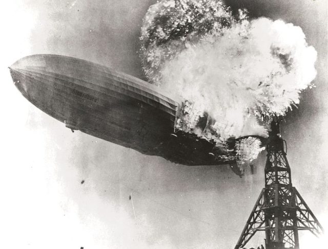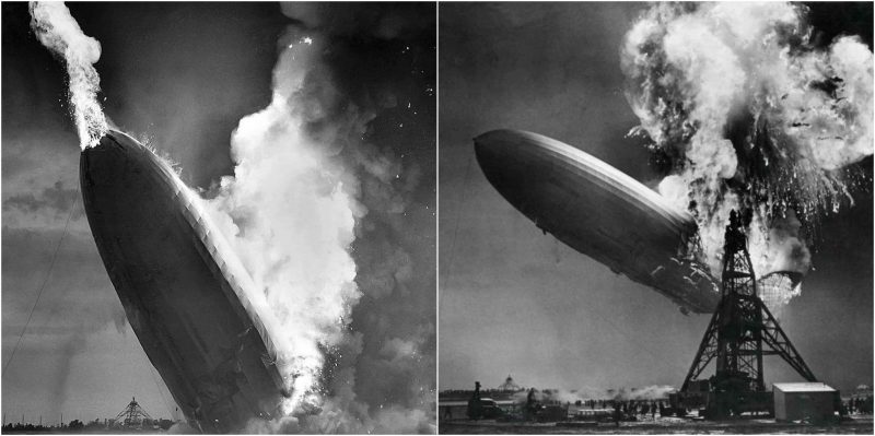 On May 3, 1937, as the German zeppelin airship Hindenburg was attempting to land at Lakehurst, New Jersey, a spark reacted with a hydrogen gas leak and caused an explosion.