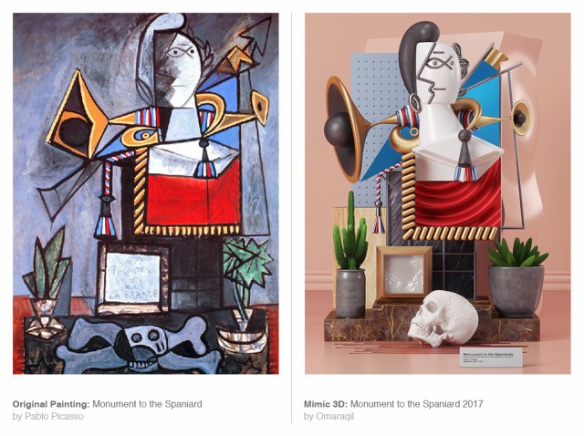 In the latest series of his new visual experiments using art from the past, titled MIMIC, the Pakistani digital artist randomly picked 6 of Pablo Picasso’s paintings and by using Photoshop, Illustrator and Cinema 4D-Ray he recreated them into sleek 3D visuals.