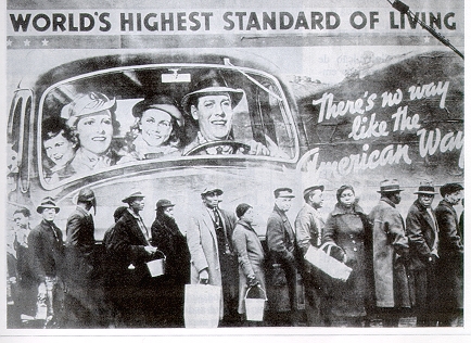 However, for most Americans, things were far from ideal and so witnesses the photography of African American men, women and children standing in a line in front of the billboard.