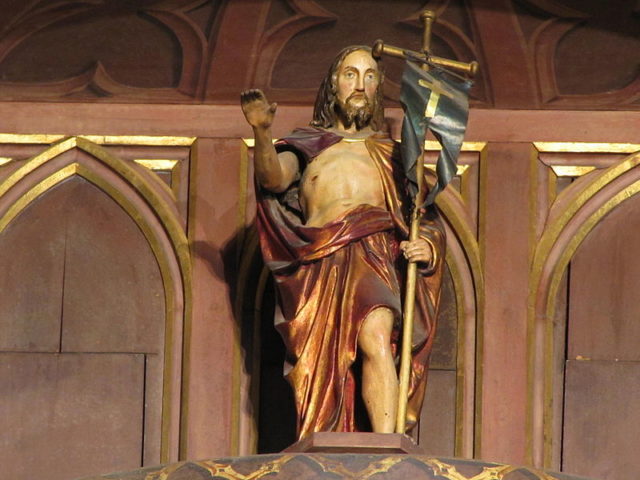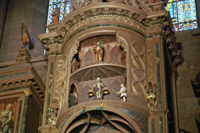 Just below that, other figures, which represent the different stages of life (a child, a teenager, an adult and an old man), parade past a figure of death. In front of the clock is the huge Pillar of Angels which represents the Last Judgment.