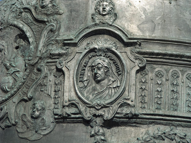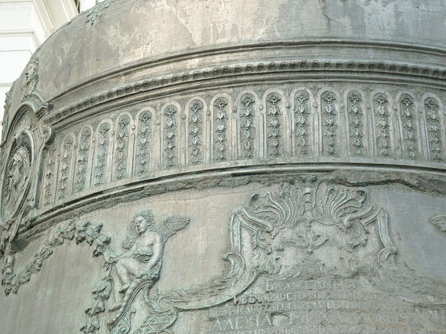 The bell is adorned with nearly life-sized images of Tsar Alexei Romanov and Tsarina Anna Ioannovna, along with plants, sacred images of saints, relief images of baroque angels, and two illustrations telling the story of the bell’s casting.