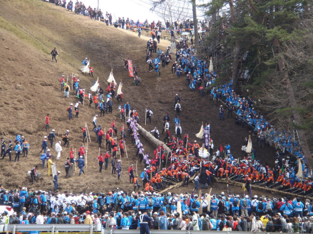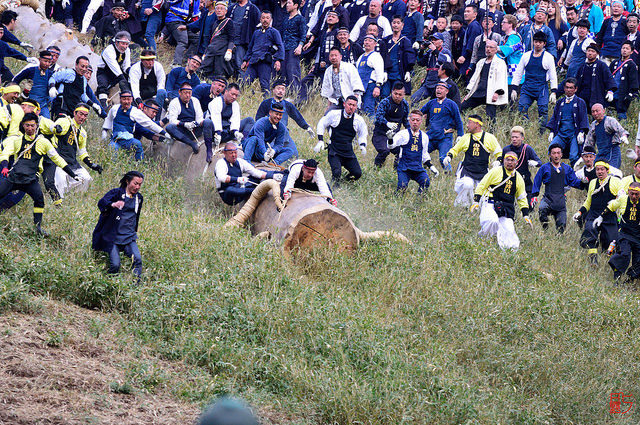The course of the logs always progresses through some rough terrain, and at certain points, participants also must drop the logs down steep slopes. Young men use the occasion to demonstrate their bravery by riding the logs, which can sometimes weigh as much as 12 tons. This part of the ceremony is known as Kiotoshi, which translates as “tree falling.”