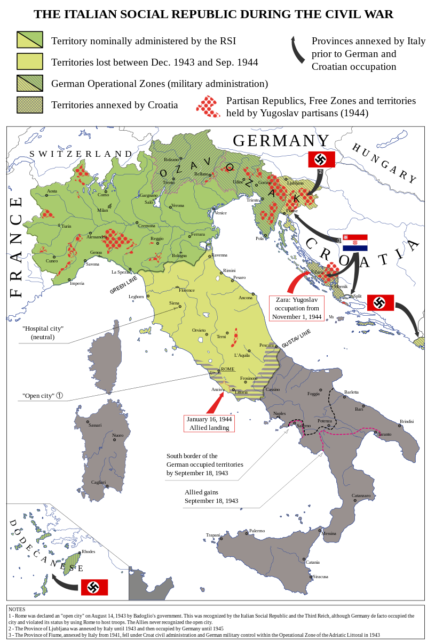 Salò, a small area near Lake Garda, was a Nazi outpost state in Italy when Mussolini was in power from 1943 until the end of World War II in 1945. The northern part of Italy was named the Italian Social Republic by Mussolini, and Salò was the headquarters for his Republican Fascist Party.
