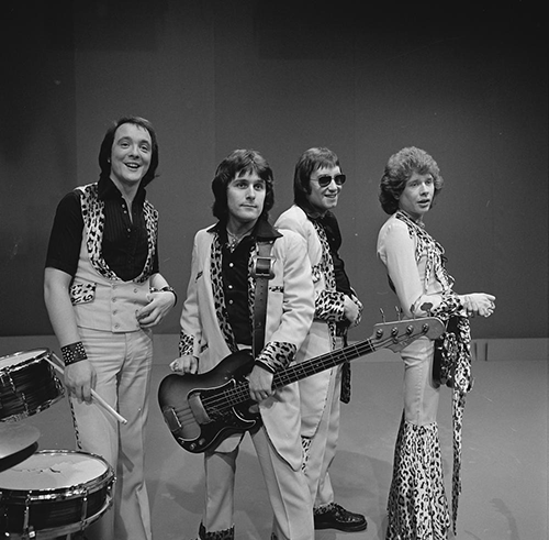 Examples of Teddy Boy-style clothing worn by Ray Stiles and Les Gray of ’70s glam rock band Mud: drape jackets, brothel creepers and drainpipe trousers. Author:AVRO – Beeld En Geluid Wiki – Gallerie: Toppop 1974 CC BY-SA 3.0