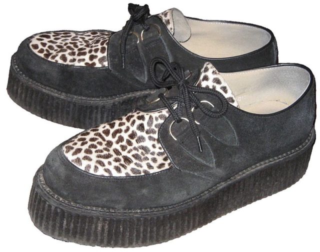 The Teddy Boy style swept through Britain in the 1950s, bringing back the Edwardian style of men’s clothing but with a definite twist. Pants were tight, jackets were a bit longer, and socks, often white, peeked out under the ankle length trousers. Vests were worn, sometimes brocade, and a skinny or western style tie topped off the outfit. Brightly polished Oxford or suede “Creeper” shoes, named after a popular dance, rounded out the look. The boys often wore bouffant or slicked hairstyles with elaborate curls in the front, similar to those of a young John Lennon.