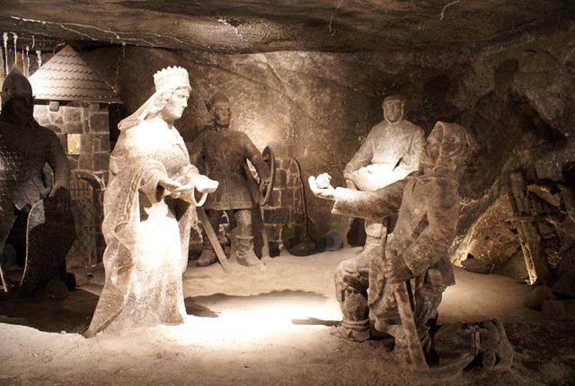 He granted his daughter’s wish and took her to a salt mine in Maramaros. Kinga took out her engagement ring and threw it into a shaft. When she arrived in Krakow, the princess asked the miners to dig deep into the mine until they found a rock. They found a lump of salt and inside it was Kinga’s ring. After this story, she became the patron saint of salt miners, who kept them safe while they were working.