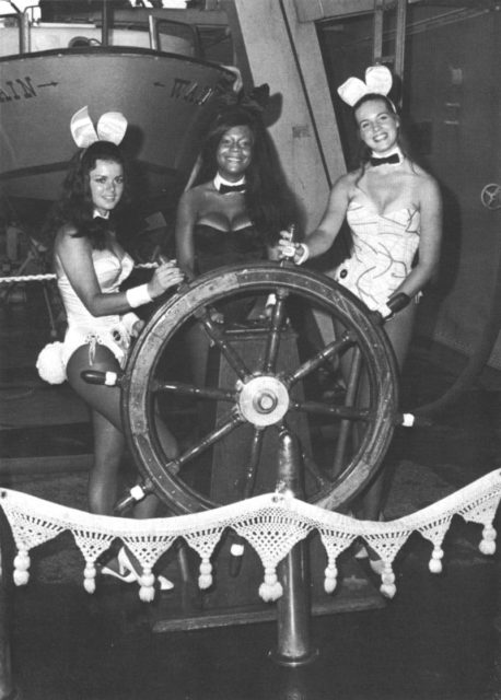 New York Playboy Club Bunnies, Waren Smith, Tiki Owens, and Liz James, aboard USS Wainwright c1971