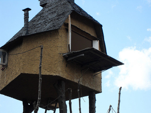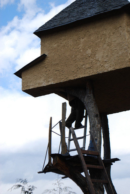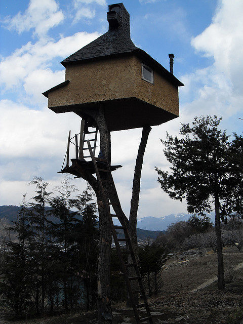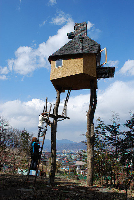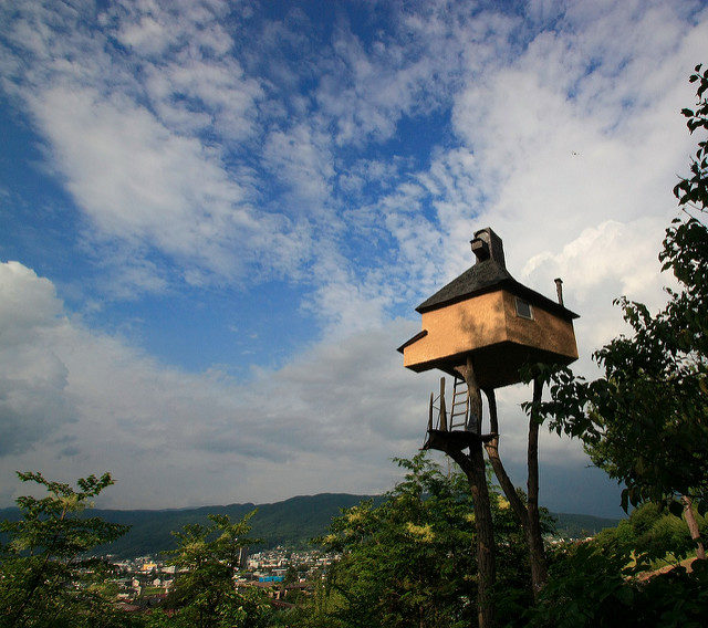 The literal translation of Terunobu Fujimori’s tea house, Takasugi-an, is “a teahouse [built] too high.” The two chestnut trees on which the statuesque building sits, about 20 feet above ground, were cut from the nearby mountain. The architect pushed the limits of traditional Japanese tea house design since it seems quite a challenge to access Takasugi-an, but once inside, one immediately forgets about the difficulty of climbing the free-standing ladders in order to get up there.