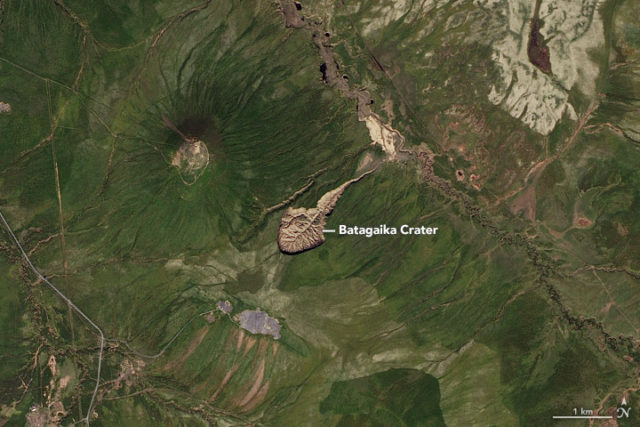 Siberia is peppered with these craters, called “thermokarst depressions,” but one, in particular, is being watched with great interest. Batagaika Crater, found near the village of Batagai in the Verkhoyansk district, was created after the deforestation of an area near the town took place in the 1960s.