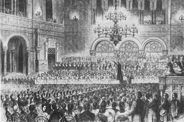 Franz Liszt’s fundraising concert for the flood victims of Pest, where he was the conductor of the orchestra, Vigadó Concert Hall, Pest, Hungary 1839.