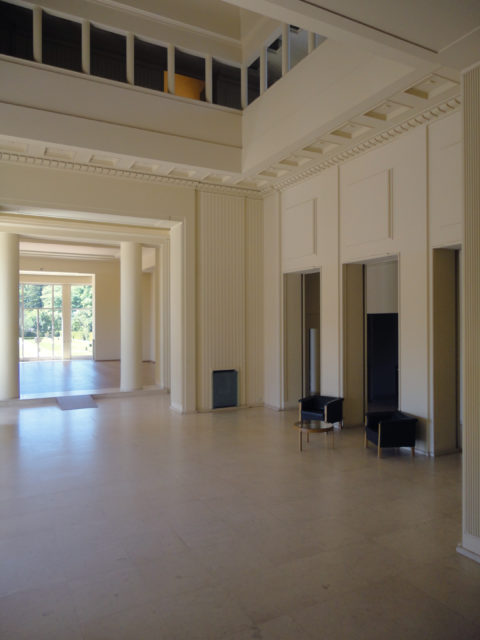 The interior of the villa consists of three floors and a two-story central hall that invite social gatherings. An elaborate iron gate designed by Edgar Brant divides the social zone from the luxury private rooms upstairs and the service room and library on the ground floor. The villa is located on the highest point of the property and is completely surrounded by an impressive garden. It is full of natural light provided by many windows and a skylight, which makes the garden a feature that is present all the time.