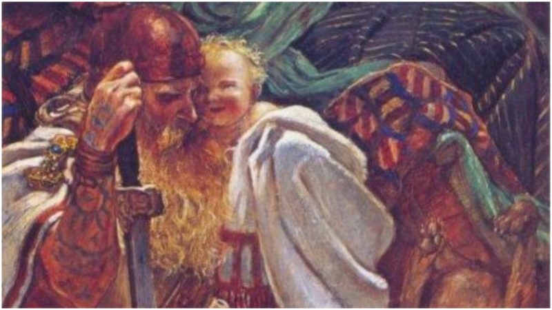 He then went hunting and left the hound and the baby alone in the house. When he returned, he saw a dreadful scene. The cradle was overturned, the child was missing, and Gelert stood there smeared with blood. The furious Prince drew his sword and killed the dog, thinking that he murdered his child.