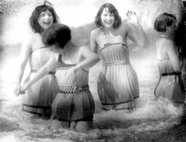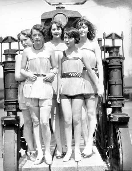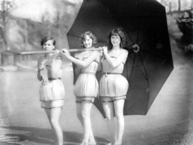 The girls in the pictures look happy and satisfied with their flimsy wooden suits, but only they know if they were really comfortable. The question that comes to mind is: where these spruce veneer bating suits also useful as life vests?