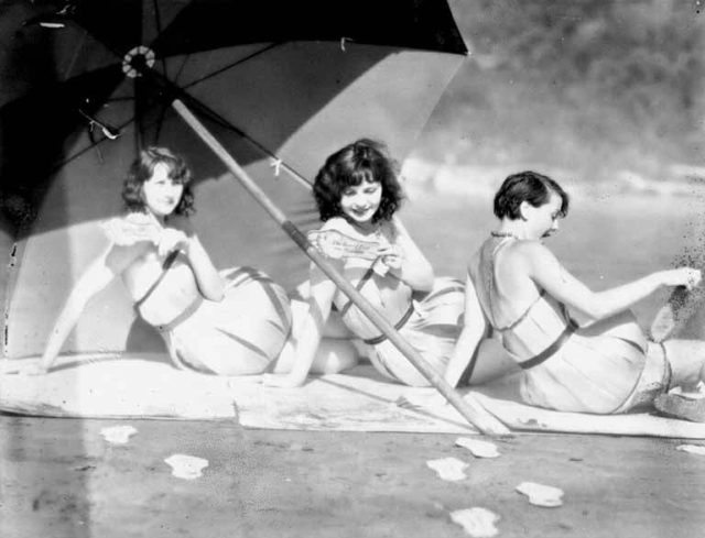 Three “Spruce Girls” wearing wood veneer bathing suits sitting under an umbrella and holding wooden boards shaped like feet, Hoquiam, Washington. Author: University of Washinton/Flickr
