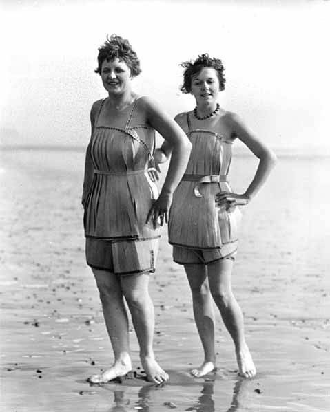 Two “Spruce Girls” standing on the beach wearing spruce veneer bathing suits, probably near Hoquiam, Washington. Author: University of Washinton/Flickr