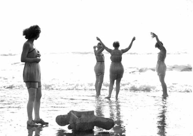 “Spruce Girls” on beach wearing spruce wood veneer bathing suits during “Wood Week” to promote products of the Grays Harbor lumber industry, Hoquiam, Washington. Author: University of Washinton/Flickr