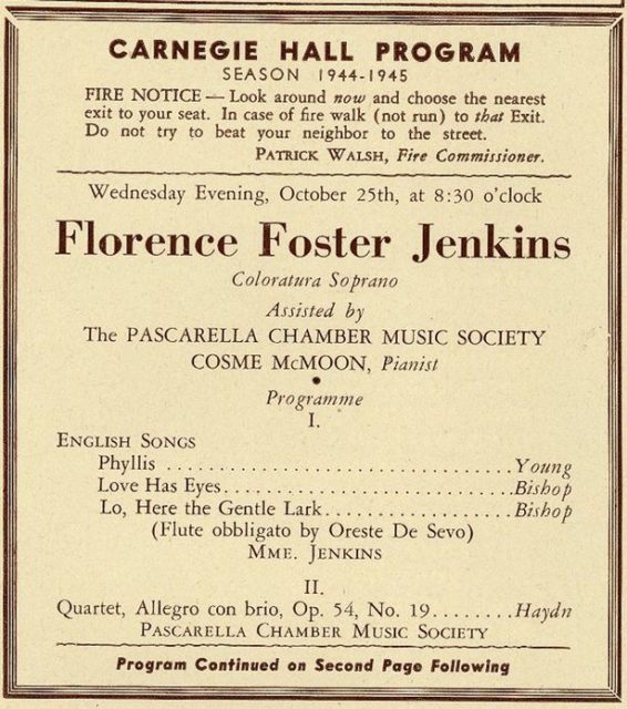 That being said, however, Mark Twain also wittily remarked that “all you need in this life is ignorance and confidence, and then success is inevitable.” On that note, a wealthy gal from New York with a strong desire to be the greatest opera singer that ever lived, on October 24, 1944, realized her dream and sang in the prestigious Carnegie Hall in front of a sold-out crowd, despite being “tone deaf” and having no talent for singing whatsoever.