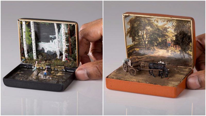 The Daguerre and Bouton Diorama illusions differ somewhat from the modern dioramas that we are familiar with today, the often intricate miniature static scenes of everyday life, historical figures, events, people, and landscapes. Creating miniature dioramas means building a whole new world and letting the viewers become part of another epoch. At least that’s what Canadian-Trinidadian artist Curtis “Talwst” Santiago has to say about his captivating series of miniature historic dioramas inside of vintage ring boxes.