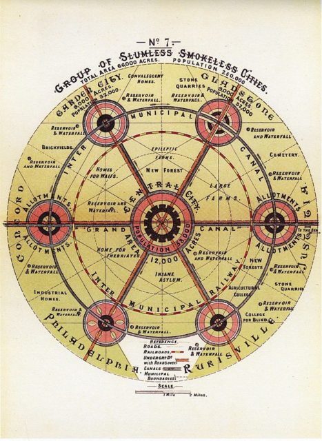The concept of a radial city was heavily influenced by another technological enthusiast from the 19th century and an English founder of the garden city movement who also had a thing for city planning, the British planner Ebenezer Howard and his Garden Cities of To-morrow. His book, To-Morrow: A Peaceful Path to Real Reform, published in 1898, gives concrete descriptions of a utopian city where people live harmoniously with nature, ideas that were in those times a real revelation and changed the field completely. Now, many of his ides and principles are being used in modern town planning.