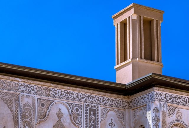 The rooftops have a unique appearance because of the famous 40 meters high wind towers, a special Persian feature that secures the air conditioning during the hot summers. In the middle of the building is a rectangular courtyard, usually full of wells, pools, fig trees, grapevines, and pomegranates.