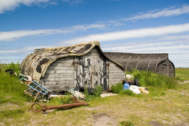 The upturned boats are coated with tar to make them waterproof, but being so close to the sea for a long period, many of the sheds have still become rusted and decayed.