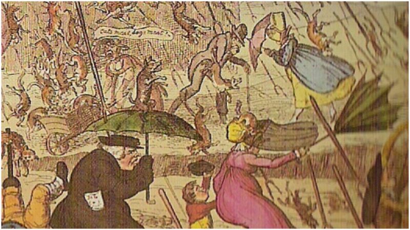 Ano a her dubious claim has it that before British towns had decent drainage and sewer systems, heavy storms caused severe flash flooding, drowning dogs and cats, whose bodies would float for days later. People might’ve thought the dogs and cats had fallen from the skies, like a Biblical rain of frogs.