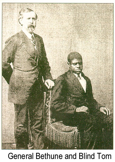 At the age of eight, the boy already known as Blind Tom, was “loaned” to Perry Oliver, a concert promoter who toured with him throughout the U.S. Performing four times a day, Blind Tom was earning up to $100,000 a year (equivalent to $1.5 million in 2004), more than any known pianist at the time. Sadly, the money went to his promoter and owner. He was still a slave, although reportedly unaware of it. Nor did his music and talent convert many of the racists. When Tom went on tour in the South with Bethune, many of his performances were canceled due to racist hostility.