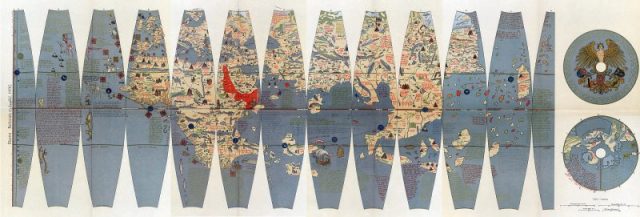 After more European voyagers started sailing the Seven Seas, globe-making became a more established craft in Europe. One globe that intrigues many because of its age and uniqueness of construction is the Erdapfel, German for “earth apple.” This is the world’s oldest surviving terrestrial globe. Credit for its creation goes to Martin Behaim, a polymath of his day who knew a lot about geography and philosophy–and was also skilled as a salesperson. His globe shows the world as people of the late 15th century understood it.