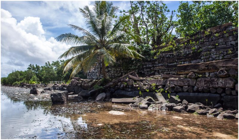 Given its beauty, the numerous waterways between islets, and its sheltered position in a lagoon, Nan Madol is nicknamed the “Venice of the Pacific.” The stone walls around the city’s perimeter enclose an area around one mile long and half a mile wide.