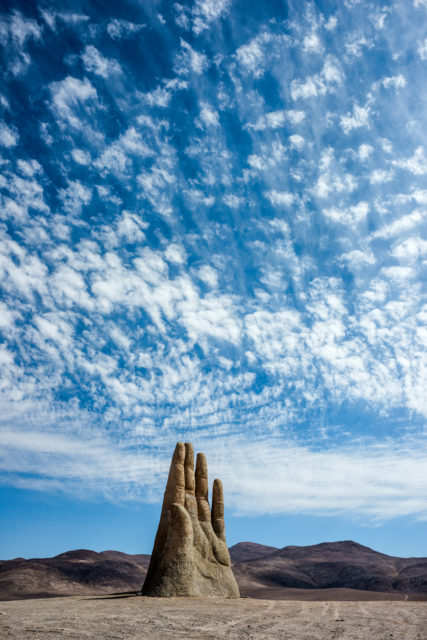 The Atacama desert rests undisturbed by any sign of human activity with its monotonous sight that seems even more alien than the desert itself. A small gravel road about 75km south of the town of Antofagasta marked 1309 on the Pan-American Highway, leads to a large 11-meter-tall cemented hand, protruding above the sand. It is the work of the Chilean sculptor Mario Irarrázabal, named La Mano del Desierto or ”the Hand of the Desert.”