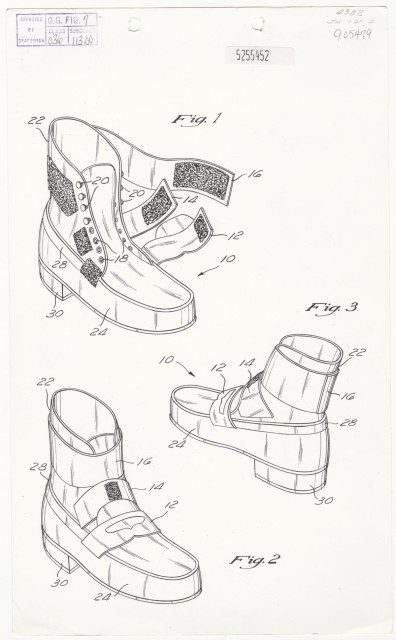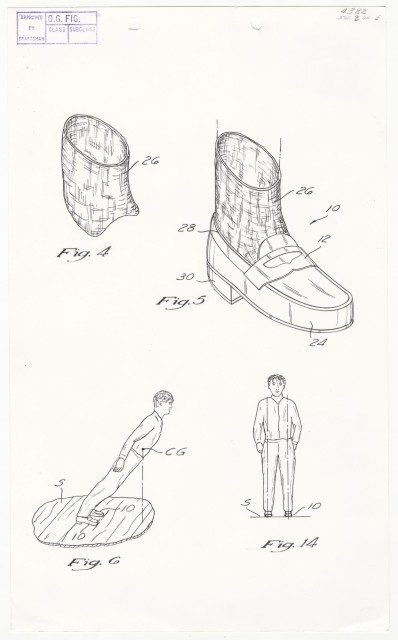 Or more specifically, as the co-inventors summarized it in their patent claim, “a system for allowing a shoe wearer to lean forwardly beyond his center of gravity by virtue of wearing a specially designed pair of shoes which will engage with a hitch member movably projectable through a stage surface. The shoes have a specially designed heel slot which can be detachably engaged with the hitch member by simply sliding the shoe wearer’s foot forward, thereby engaging with the hitch member.”