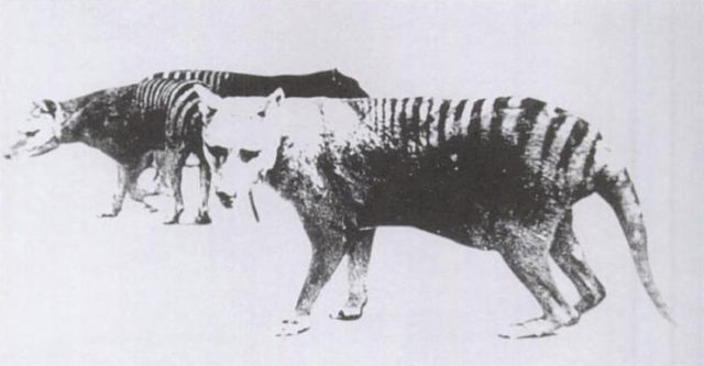 The Tasmanian tiger was emblematic for the stripes it had on its back, both males and females; its scientific name in Greek translates to “dog-headed pouched one,” largely because of the resemblance to the canine, and the presence of a pouch in both the sexes.