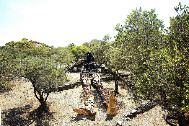After entering Port Lligat, it is impossible to miss the big white egg standing on one of the terracotta roofs in front of DalĂ’s house. It is one of his sculptures among the many that he installed in and around the property. The weirdest installation is a giant man made of wood lying in the gardens looking much like the character of Gulliver from Gulliver’s Travels.
